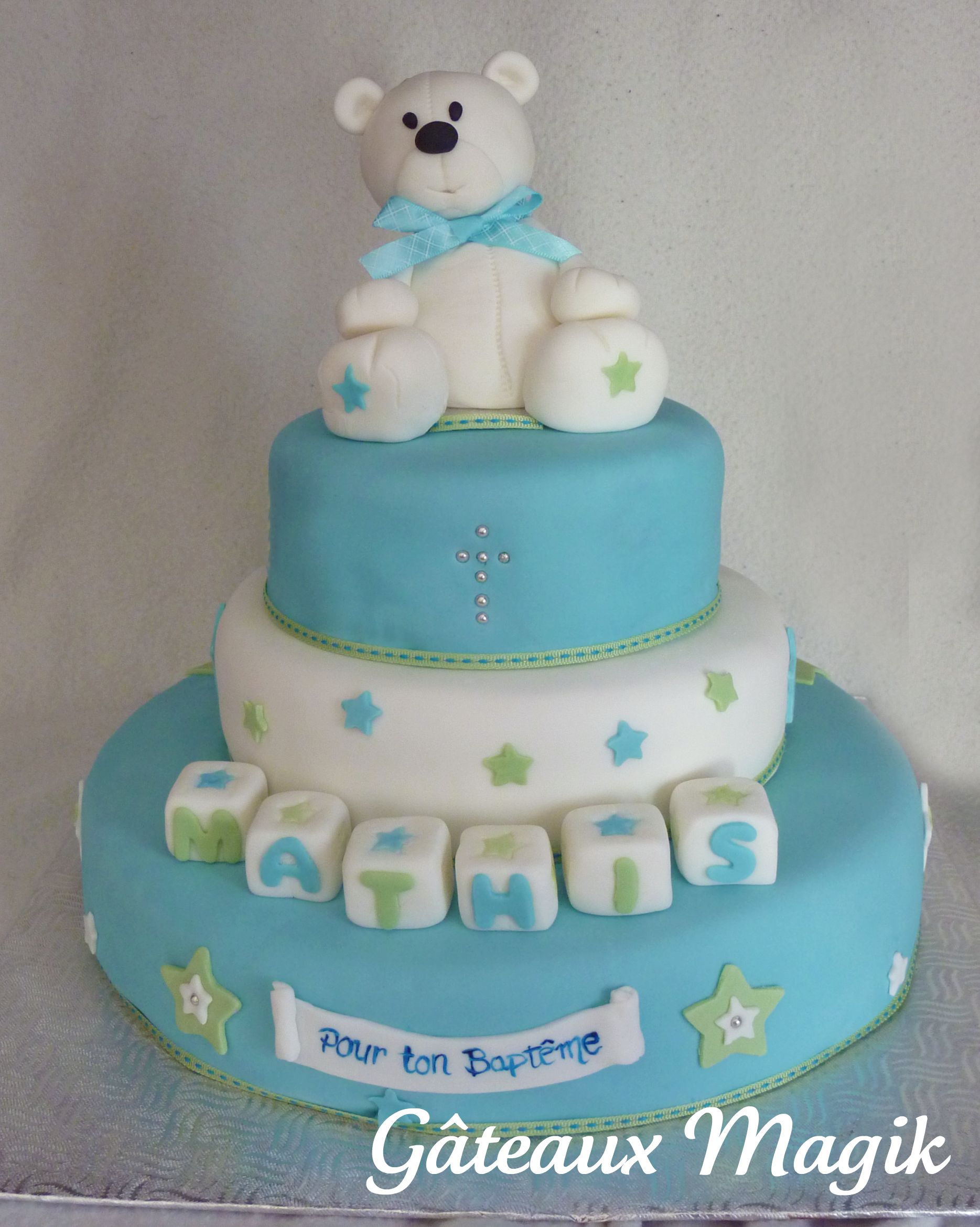 Bas: gâteau au chocolat, crème au beurre chocolat Milieu et haut: gâteau aux amandes, crème au beurre vanille+amande Ourson en pâte de sucre et rice krispies